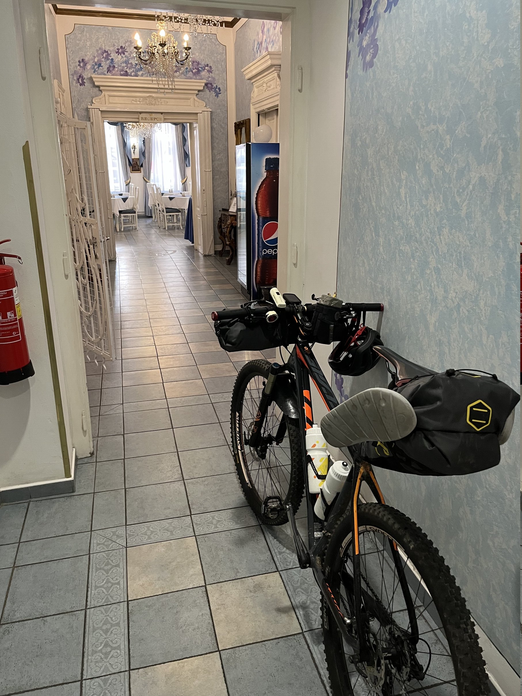 I thought the final descent into Karlovy Vary (Carlsbad) would be relaxing—of course, it wasn’t! It was much steeper and more winding than I expected, forcing me to brake constantly. At one point, in a moment of distraction (I was probably just exhausted from the sun), I missed a turn and went straight down a slope. I had a split second to react—just enough time to jump off the bike before crashing into a tree. There I was, lying on the ground, my leg smeared with chain grease and my knee scratched from the thorns. The tree stood just a meter away. That was close. I quickly stood up and checked if everything was okay. With a surge of adrenaline, I carefully made my way down the rest of the descent to the hotel. A shower, dinner, and then I collapsed into bed.