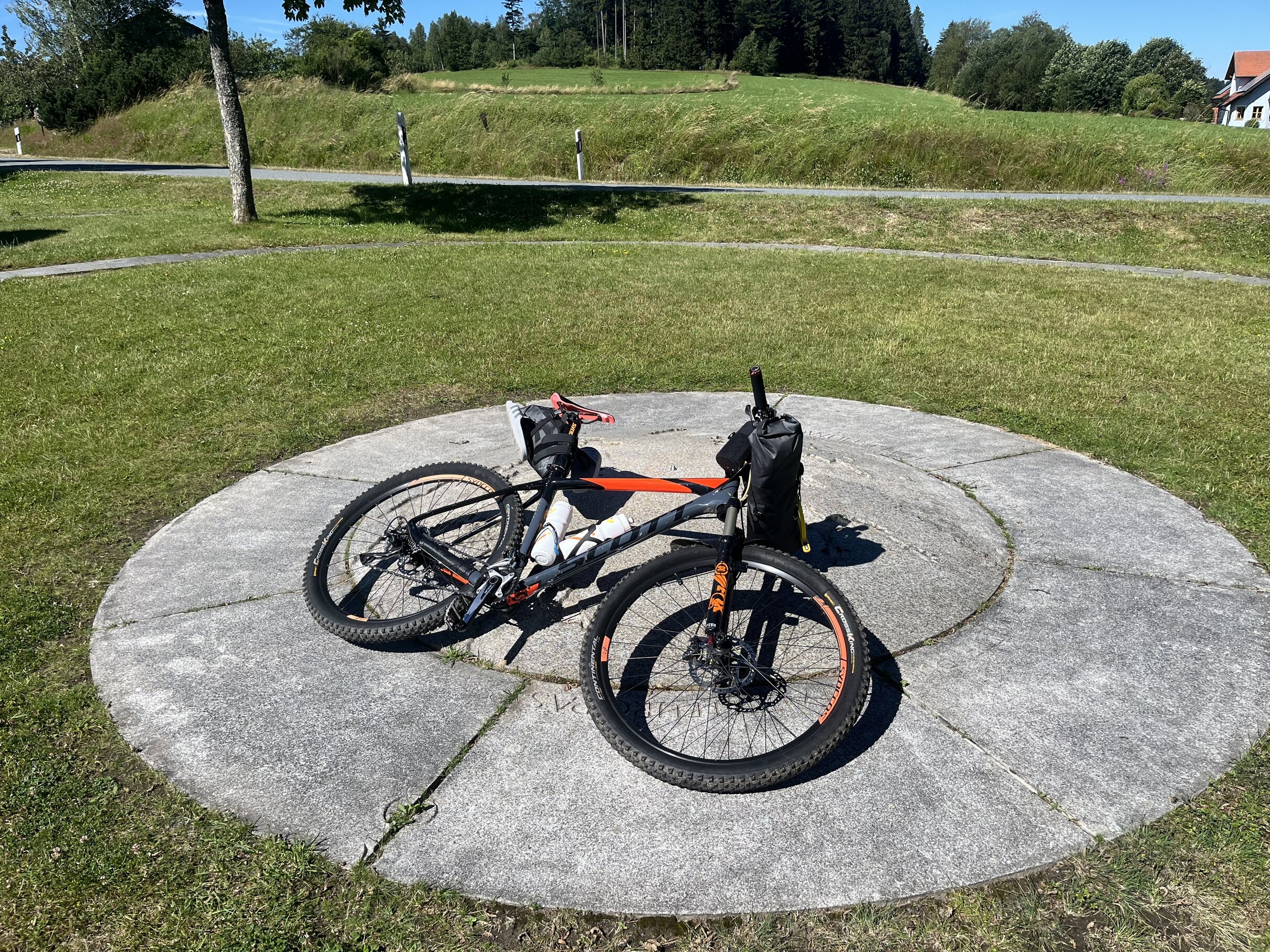 Day two started with perfect weather, and by 8 AM, the temperatures were already high. I decided to stop by a bakery and another store to grab some sunscreen—definitely the best decision I made that morning. After taking a quick look around Weiden in der Oberpfalz and having a light breakfast, I set off on what turned out to be the toughest stage of the journey. Just 5 kilometers in, I was met with a steep 650-meter climb. By the time I reached the highest point at the border, I was drenched in sweat. But the route promised an incredible downhill ride, which I was really looking forward to.