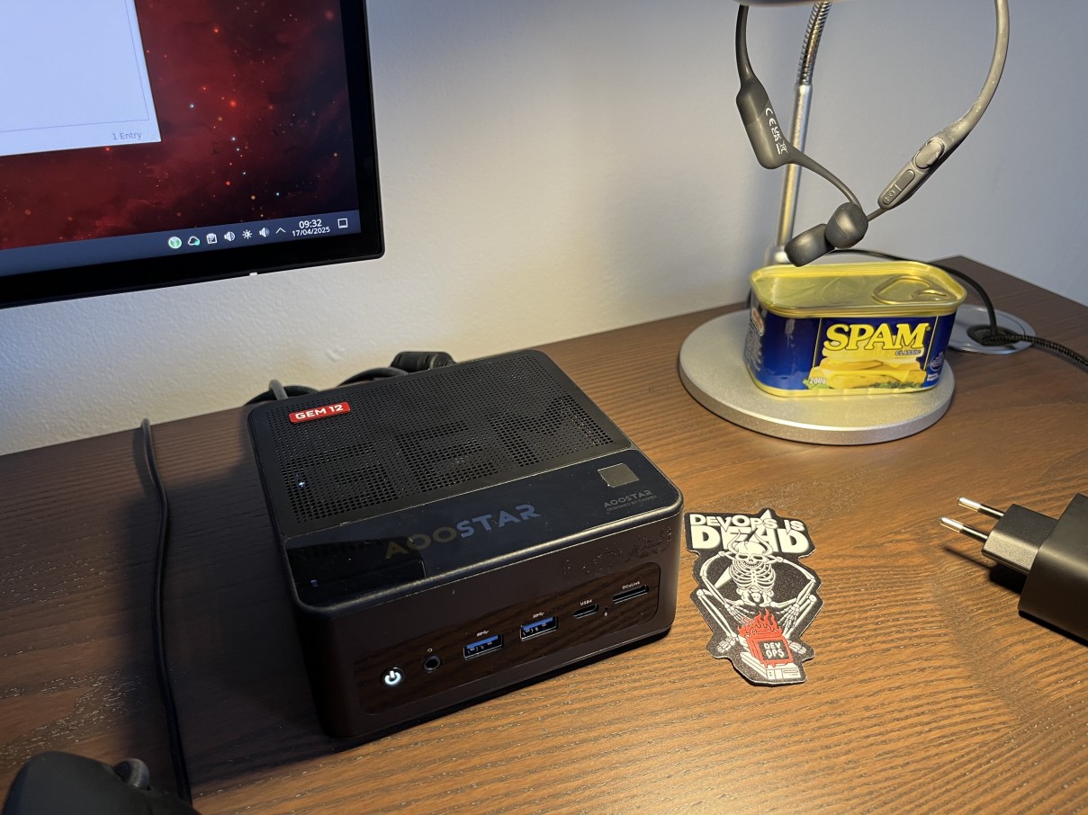 I decided on Aoostar GEM12 Pro Mini-PC and ordered it. Shortly afterwards, Aoostar support contacted me and asked if I would like to have the Aoostar GEM12 Pro MAX Mini-PC as it is shipped from the EU and not from China. Now here is the Aoostar GEM12 Pro MAX Mini-PC on my desk. (I thought the display would annoy me, but it doesn’t but I will probably disconnect it next time I open the box.)